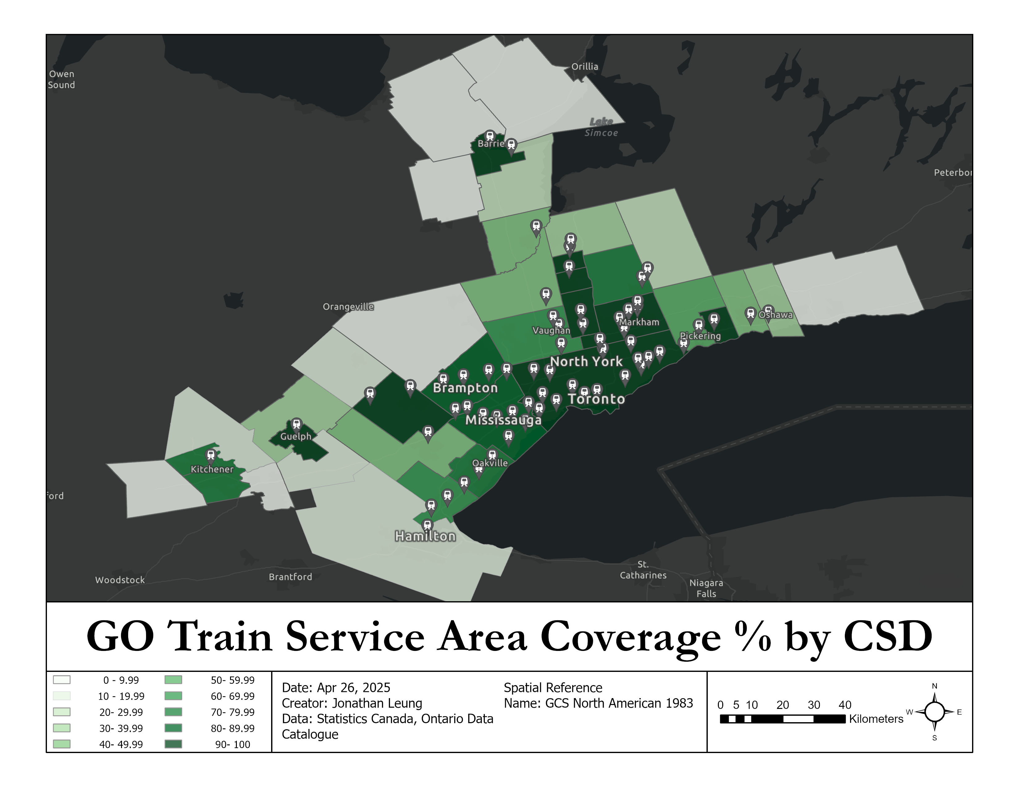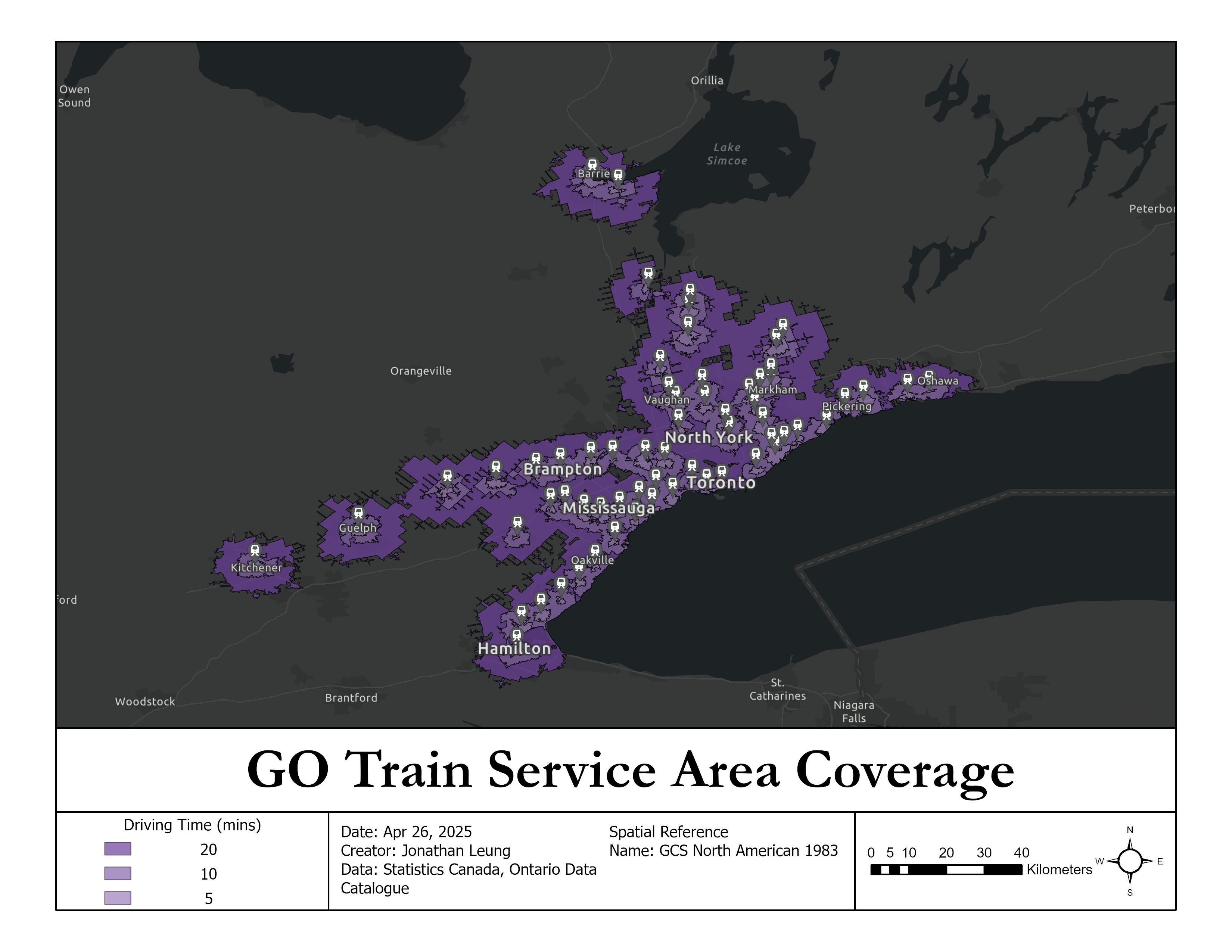 - Conducted service area analysis on the GO Train railway system to assess its service coverage across the Greater Toronto Area